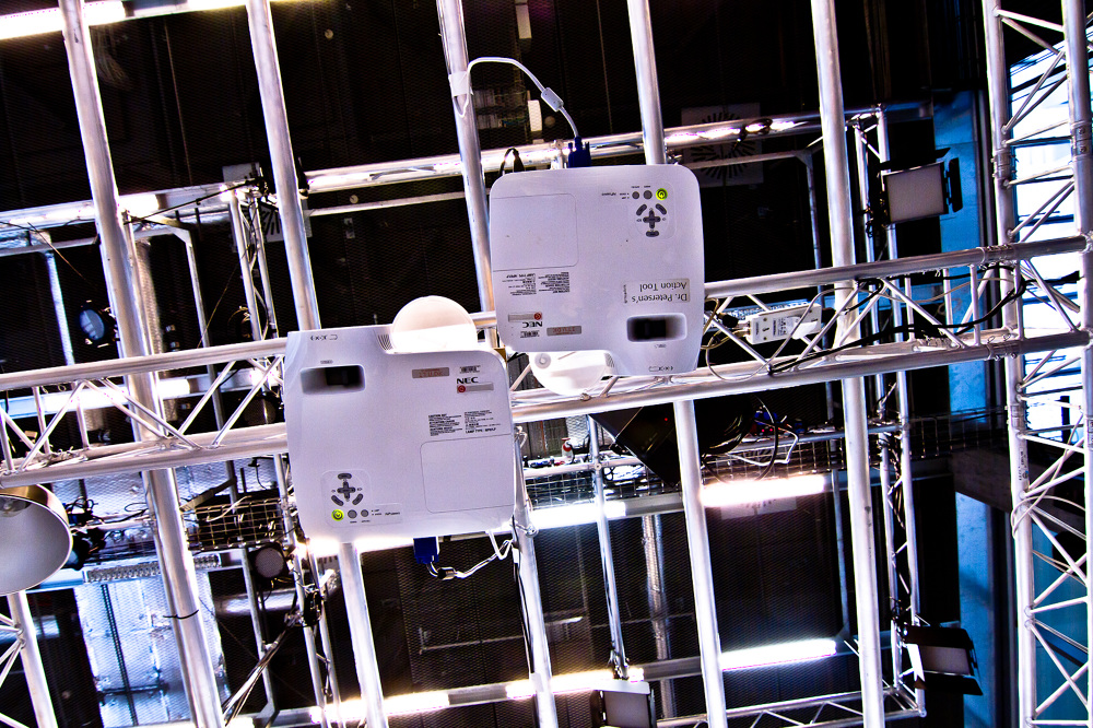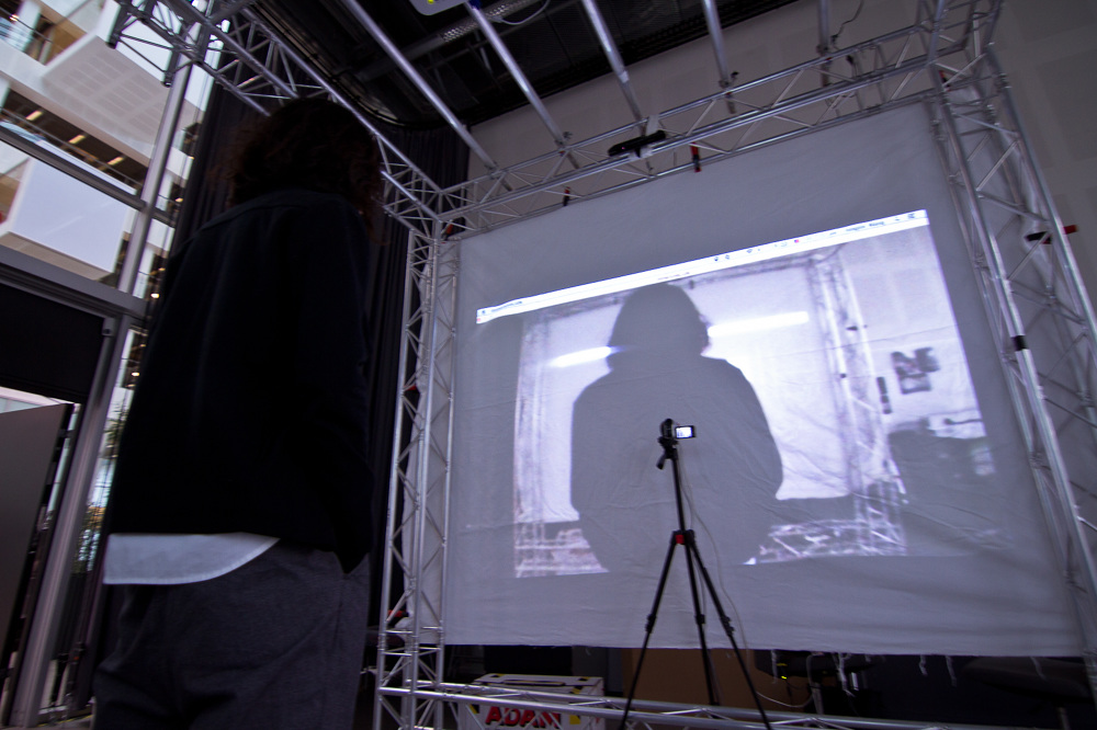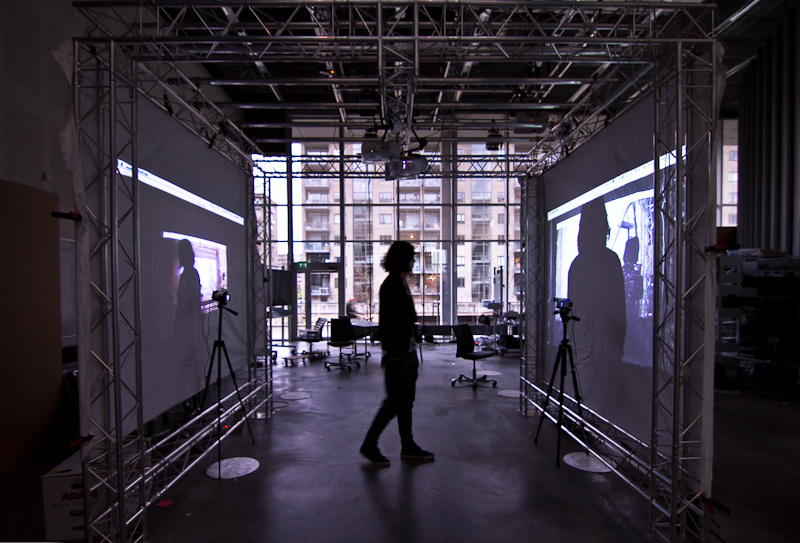 When participant enters the cube a sensor detects his presence and start to record his experience. Surrounded by two wall projections of previous participants videos and cameras positioned mirrored positioned helping giving an disorienting feeling.